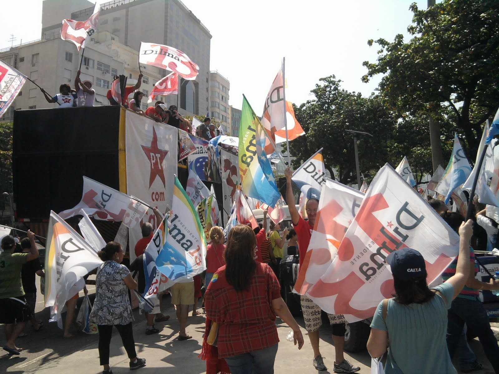 Galera próxima ao carro de som principal ao longo da caminhada. O carro de som parou em frente ao Copacabana Palace aonde ocorreram discursos como do candidato Lindberg Farias.