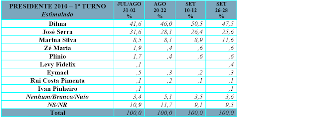 Mas de fato ela perdeu pontos entre a turminha sabida, porque na pesquisa CNT/Sensus anterior, de 10-12 de setembro, ela tinha 37,7% das intenções de voto. Bem longe, porém, do desabamento trágico registrado pelo Datafolha.