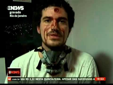 atingido pela polícia no Rio; nas proximidades, um carro de reportagem